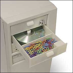 Kleargear.com has an interesting gadget that can turn empty PC drive bays into a lockable storage compartment. There's really nothing to the setup: simply take the storage drawer set and shove in into the empty slot. The company said that its unique invention would be ideal to store items that would otherwise clutter the desk: office supplies, personal items, and even up to 24 loose CDs.