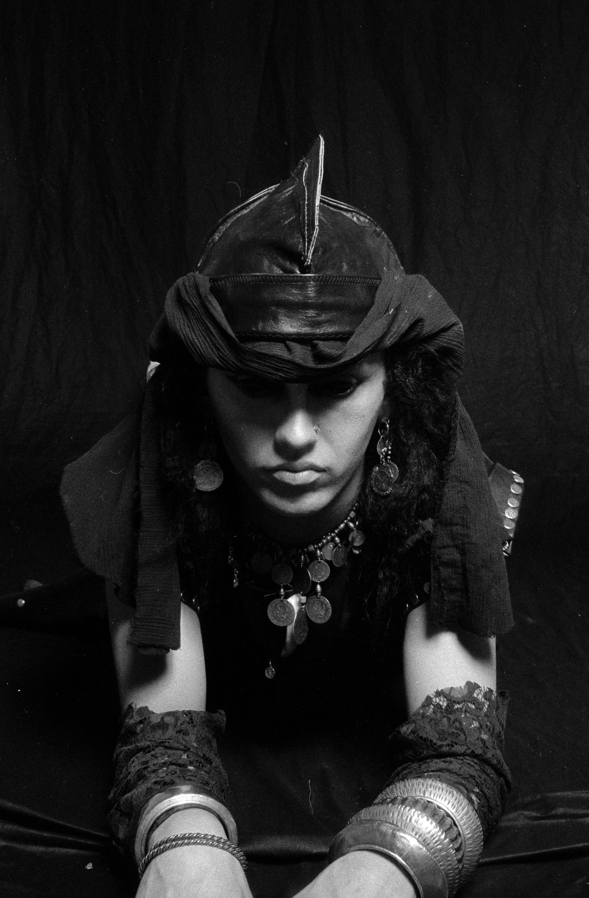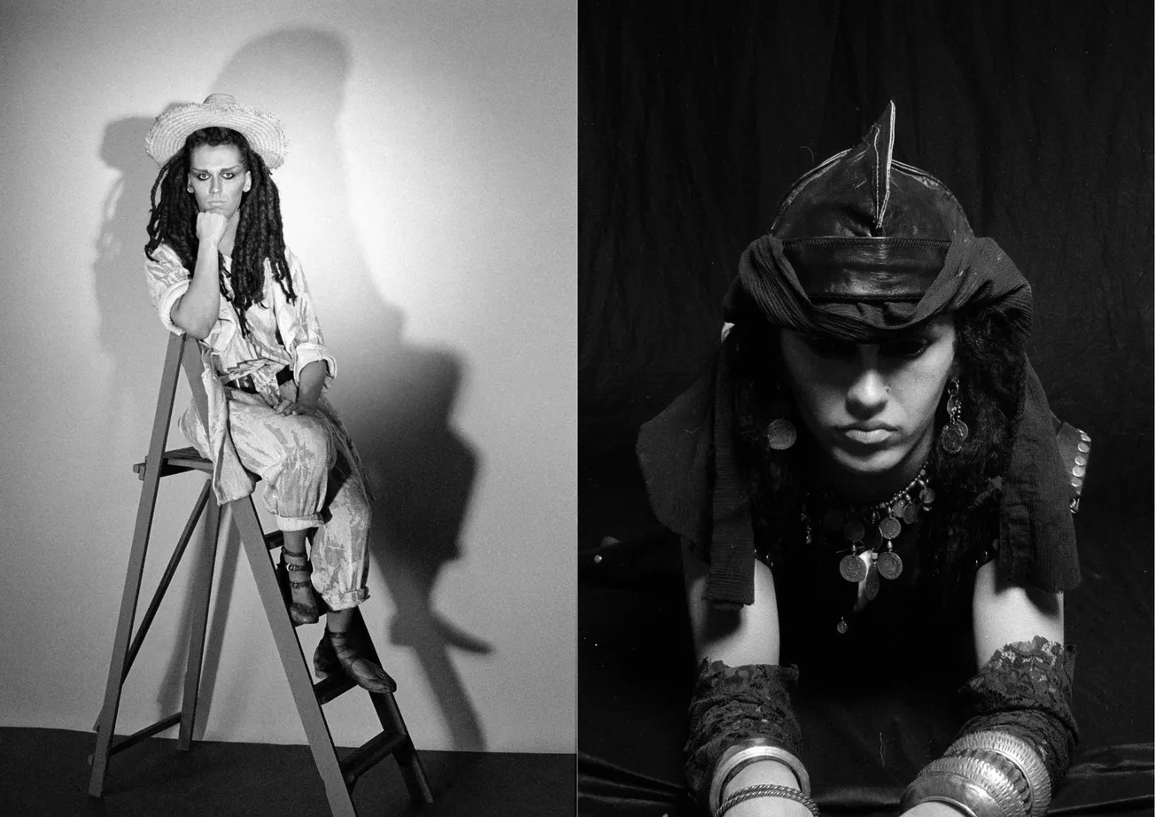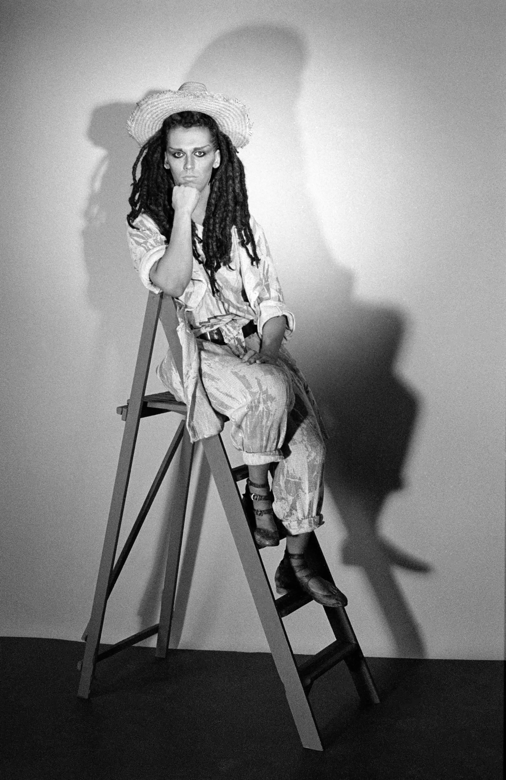 In one photo, he’s sporting red rags in tatty dreads; in the next, a cowboy hat at a coquettish angle. One outfit in particular screams Vivienne Westwood, but most of them can only have been all his own work. He’s the Queen of Sheba styled by Leigh Bowery in a schlock-horror film where Dracula meets a pantomime dame, exuding the near-miss beauty of Bolan and the fuck-you attitude of Byron. He could annihilate anybody who crossed him with a barrage of withering put-downs.