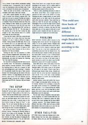 The second method is to save the data in a different manner. Pressing the Receive button a second time brings up the message "Recv Mult SysEx: Waiting For Data." After the first dump has been received, you have the option of closing the file or appending another dump to it. So, you could save these three banks as a single file and name it according to the session. This is a better option in that disk space is better utilised and there is less hunting around needed for the correct file. There is a rather interesting alternative to either of the above. Quite often, only a single sound is required for each synth in the context of a song. Pressing the patch change buttons on most synths actually sends out the SysEx data for the particular patch which has been selected. These could then be saved as a Multi file and sent back accordingly. The advantages of this are that the single sound is placed in the synth's edit buffer and so does not affect whatever is currently in memory, and also the total dump takes up a lot less space on disk and is much quicker to send. Datadisk will store the SysEx for a single sound just as happily as for an entire bank.