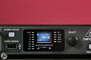 The 2U Behringer S16 digital snake is the obvious device to use with these mixers, each unit featuring 16 mic/line analogue ins and eight line-level analogue outs. Up to two S16 units can be connected together to provide 32 inputs and 16 returns over a single Cat 5e connection, and each mixer has two AES50 ports, so can accommodate up to four S16s each (though only 40 inputs can be active at a time).