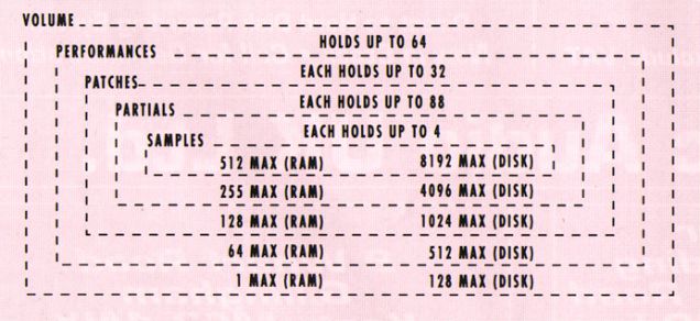 Partials (containing samples) are mapped onto the keyboard to create a Patch. A Performance can be used to assemble and mix the (up to 32) Patches employed in a particular song, or it can be used simply as a library file.