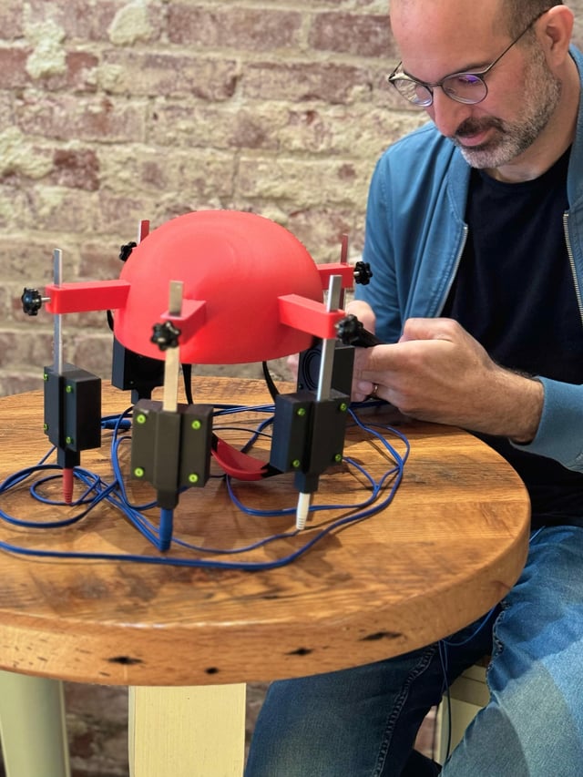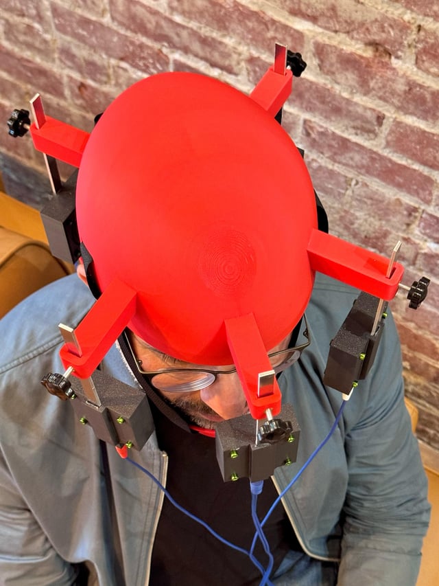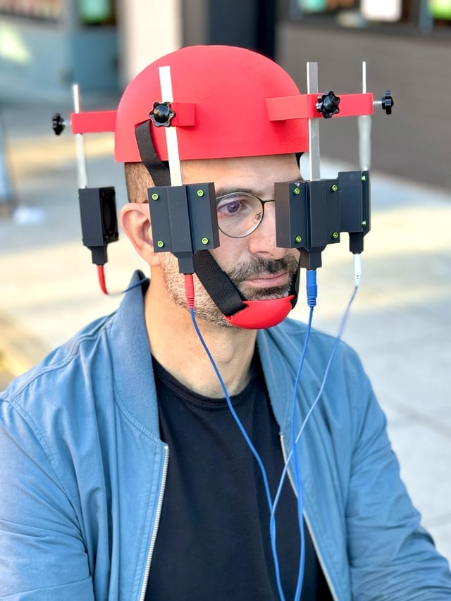 Then I came up with this idea that's a custom helmet, with chin-cup for stability, and off-ear speakers--with knobs that let you adjust the speaker height.