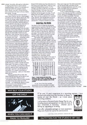 So far, it seems that there is a wide choice in the way you can filter a sampled sound. What you probably want to know is what the filters sound like. The best description I can think of is 'subtle'. You are not going to get the sound of a swept analogue filter from them, but then again, you probably wouldn't want to use such an old-fashioned sound anyway. They do make quite a nice effect, but don't be too impressed by how many filters there are and the degree of control that seems to be available. All I could achieve was, as I said, quite a nice effect. Nothing extraordinary, in fact a lot of the time I was hard-pushed to render any audible effect from them at all. The programmer of the supplied factory sample disks obviously had the same trouble...