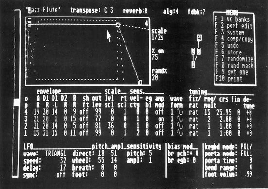 Apart from specifying the waveforms and the algorithm which a sound utilises, the programmer has access to over 100 other parameters which control the TX's production of each sound. You can turn individual operators on and off, edit the 4-stage envelopes of each operator, set their levels and sensitivity to velocity, assign LFO effect and how this manifests itself, detune each operator, set its scaling (which gives higher notes a faster attack), and adjust the frequency of each operator as a ratio of the key pressed or as a fixed value (new for the TX).