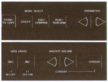 The other buttons control power on/off, Parameter Scroll (left and right, the screen isn't wide enough to show all the like parameters!), Data Entry (yes/+, no/-), and Cursor Control/Master Volume (left/down and right/up).