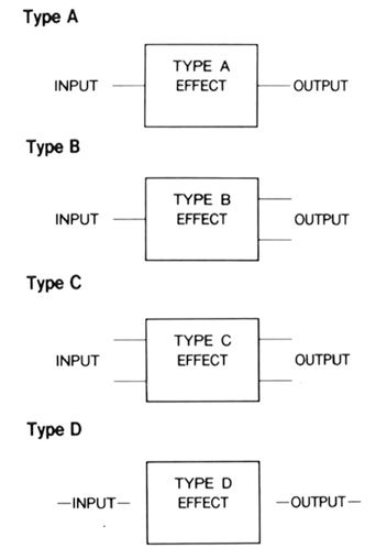 All of the 9010's different effects are listed in a separate panel, and they add up to a pretty impressive list. As a little puzzle, I'll let you figure out which of the common effects is missing from the list. (Perhaps that's Zoom's way of telling us that it's too out of date and we shouldn't be using it anymore). Each type of effect has its own input/output configuration, for which we need a diagram: Figure 1.
