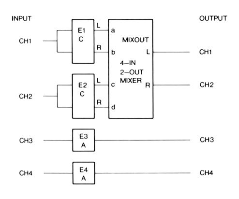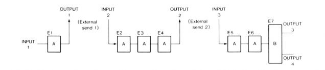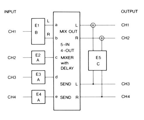 Routing 2 is the one for the keen knob twiddler. I would like to have been able to tell you the number of possible combinations of effects available here, but I don't think my Further Maths A level grade is quite high enough, especially when you consider that the mixer includes delays on the individual outputs and promises to be able to simulate the Haas effect and produce the time delay that is missing from conventional panpot image positioning. I have a feeling that the two Routings that are going to be used most, simply because they are easiest to understand, are Routings 1 and 4, so I'm going to concentrate on these. I'll let your imagination run riot on what can be accomplished with Routings 2 and 3!