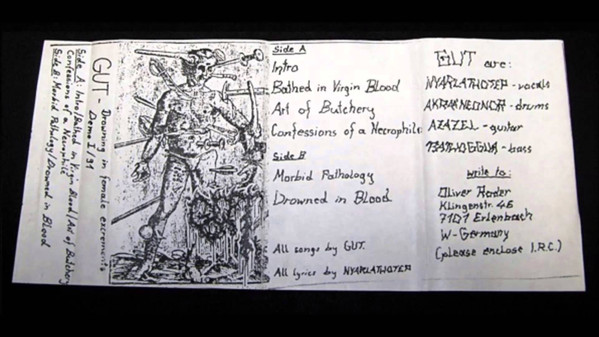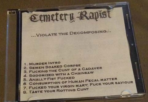 Scalped, Stimulation In A Rigormortified Whore, Jackhammer Headcrush, Asexual Virgin Killer, Gouging Out The Eyes Of Mutilated Infants, "Explosion Of A Thick, Orange, Pourage-Like Substance", Inexplicable Scrotal Mutilation, Ripped With Anal Forceps, Untitled